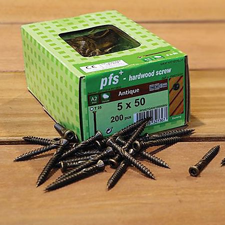 De nieuwe bronskleurige pfs+ hardhoutschroeven kunnen worden gebruikt in combinatie met allerlei soorten (hard)hout, composietplanken, bamboe … De draad onder de kop bevestigt de terrasplanken permanent aan de onderconstructie, waardoor kraakgeluiden sterk gereduceerd worden. Bovendien vallen de schroeven door hun bronskleur minder op in het hout.